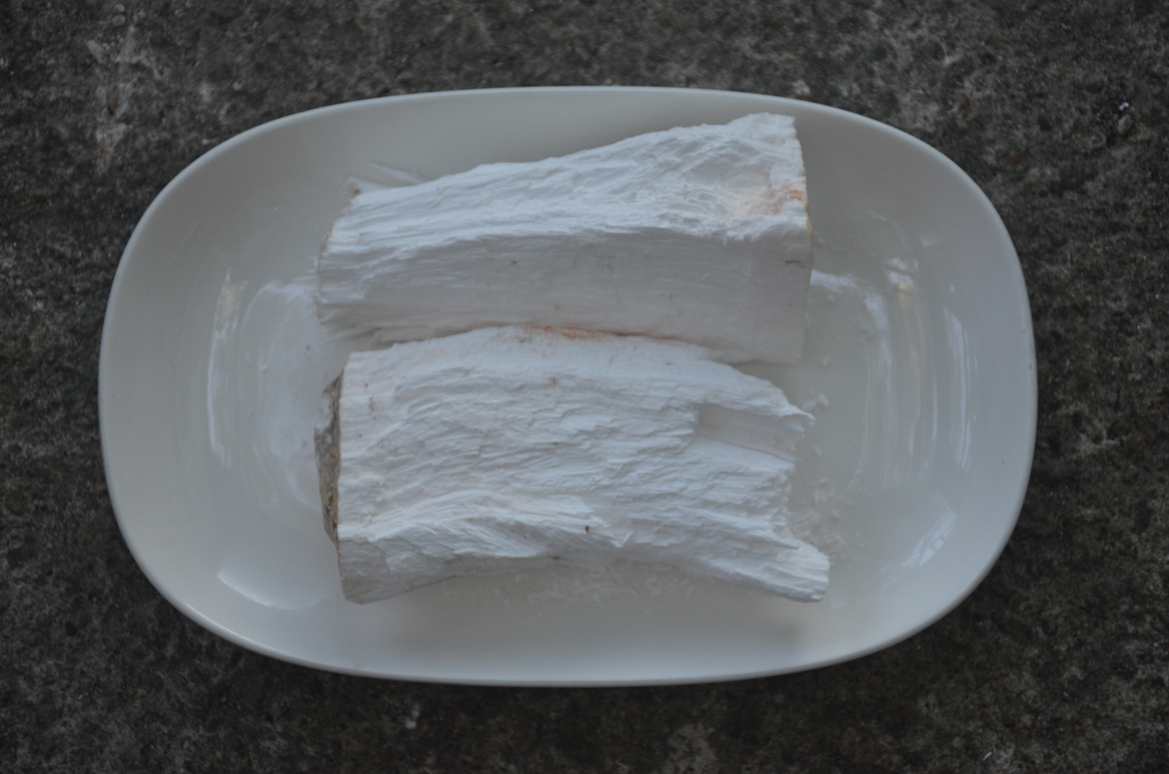 那是30年前就學會的技術,使用木炭火爐來自做燒石膏,將石膏埋在起火的木炭中,火燒石膏讓石膏自身燃燒,隔夜木炭燒燼,在灰中拿出燒成白色的燒石膏,以研缽磨細加上紅心地瓜粉就可用來製作豆花了
